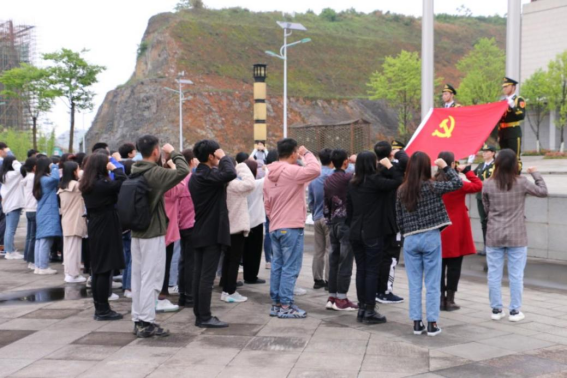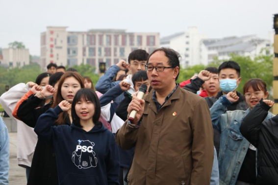 升旗仪式结束后,在国旗下,面向鲜红的党旗,由学院党委副书记、院长兰东兴的领誓,举行新党员入党宣誓、老党员重温入党誓词仪式。