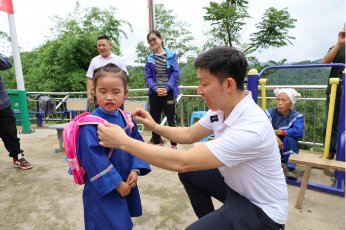 教工党支部书记韩洪雷给幼儿园的小朋友发书包 邰昌元 摄