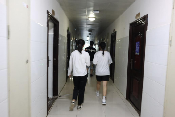学生会成员在学校活动中心集合完毕后,各部门分小组,分宿舍区,就寝室管理规范和要求对学生寝室逐一进行检查。