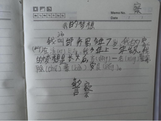 随后,志愿者们来到教室看望一年级的小朋友,李雪艳同学问一年级小朋友邰秀军他的梦想是什么,小朋友回答说长大后想要当警察。随后李雪艳教邰秀军写作《我的梦想》;申巧丽鼓励潘雨欣小朋友唱歌,小朋友唱了一首《桥边姑娘》送给志愿者们;张笛华问杨新语小朋友《静夜思》中“床前明月光”的下一句是什么,小朋友对答如流;王倩教邰子轩小朋友他姓氏中“邰”字和年级的“级”的正确写法。