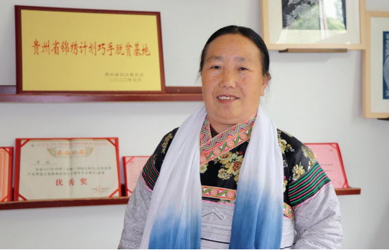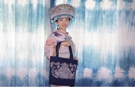 富纳刺绣厂的苗族妇女杨群会展示创新后的蜡染手提包