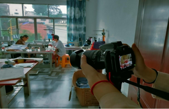 8月16日上午调研团队到达湾子寨村富纳刺绣厂所在地址,根据实地情况调整调研方案后,下午在负责人黄梅的带领下参观刺绣厂妇女做工环境,并拍摄黄梅运作刺绣机器和正在雕花刺绣的妇女们。