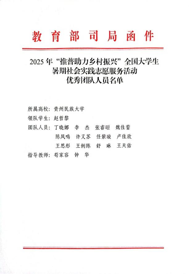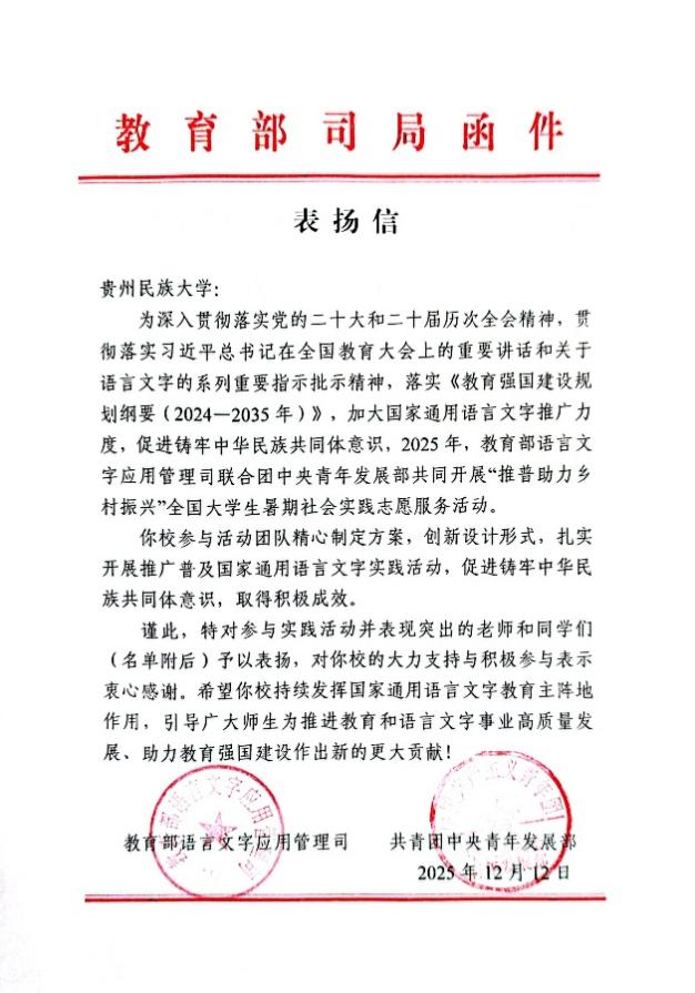 值得一提的是,这已不是我院推普团队首次获得国家级表彰。早在2022年,我院“薪火传递”推普实践团队在“推普助力乡村振兴”全国大中专学生暑期社会实践志愿服务活动中获评优秀团队,并收到教育部语言文字应用管理司及共青团中央的表扬信;2023年,我院“薪火黔进”推普实践团队又凭借扎实成效获得教育部及团中央联合表扬。