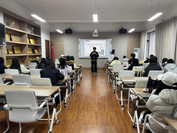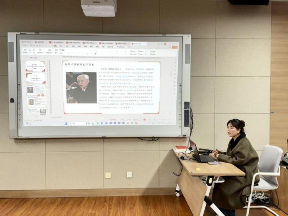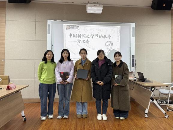 2024级新闻实验班的宋一诺同学聚焦方汉奇先生的著作《中国新闻事业通史》,为在场师生开启学术分享的序幕;随后,2025级新闻与传播专业的刘明露同学沿着“学术生涯——学科贡献”的脉络,系统梳理了方汉奇先生的学术历程,凸显其在新闻史学领域的奠基意义;2025级戏剧与影视专业的范唯同学则在分享会现场播放了思想政治研究会采访方汉奇先生的访谈视频,以影像结合解读的形式,让大家更直观地感受先生的学术风范;2025级新闻传播班的代盛兰同学则以《中国近代报刊史》为核心,细致拆解书籍内容、分析著作的学术价值,并引导师生探讨方汉奇学术思想对当代新闻实践的启示;2025级戏剧与影视专业的杨春英同学以“是否看过《中国新闻事业通史》”为话题开启互动,有效提升了学术分享的参与感;2025级新闻与传播专业的王田田同学以“史海燃灯”为主题,从“学术奠基、育人初心、治学精神、家国情怀”四个维度,深入解读方汉奇先生在新闻史学领域的坚守与传承。