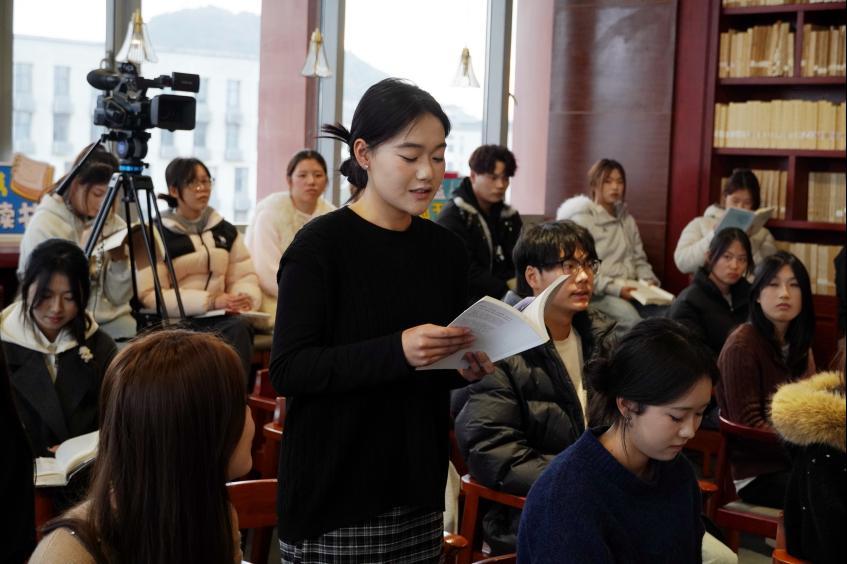 在诗词品鉴环节,同学们围绕《峨眉山月歌》《登高》等与地域相关的经典诗作展开分享,从文人笔墨里探寻钱理群先生“生命原点”的文化根源,梳理地域文化与个人精神成长的关联。针对书中“扎进生活”的观点,现场师生从不同年龄与专业角度,分享经典文本对创作灵感的启发,探讨如何让作品兼具思想深度与生活温度。