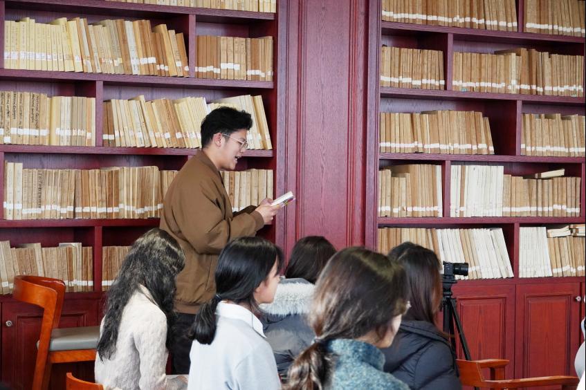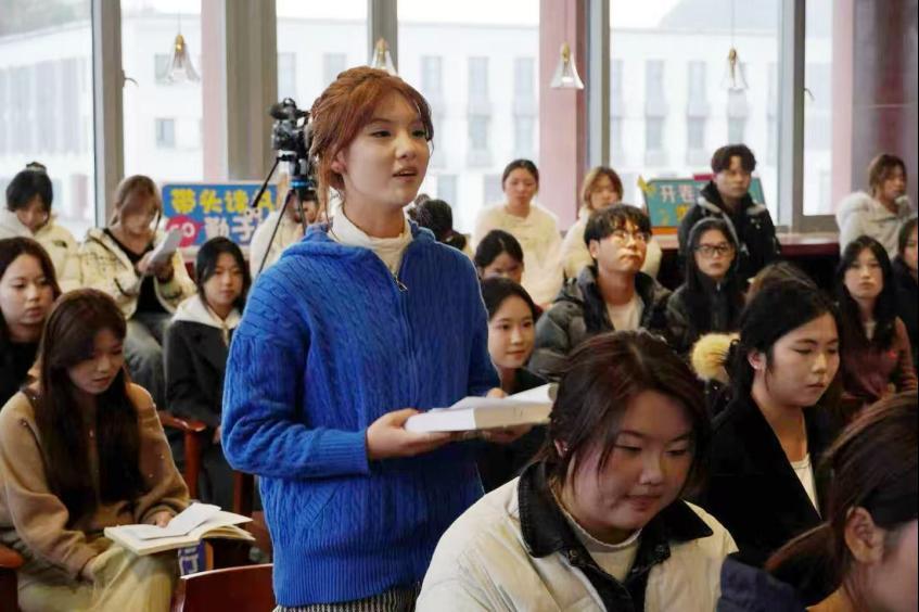 分享会伊始,胥老师结合自身经历解读《认识脚下的土地》,她认为,钱理群的《认识脚下的土地》从不是一本冰冷的地方文化研究著作,而是一位八旬学者用二十载光阴,写给故土、写给青年、写给时代的精神答卷——既是他与贵州半个多世纪情感羁绊的沉淀,更是在全球化浪潮中,为“精神漂泊者”寻找生存之根的温暖指引。随后,播音与主持艺术专业学生龙荣宇朗诵艾青诗作《我爱这土地》,真挚地表达与书中的乡土关怀形成共鸣。
