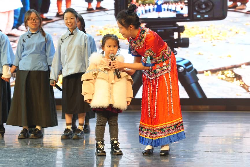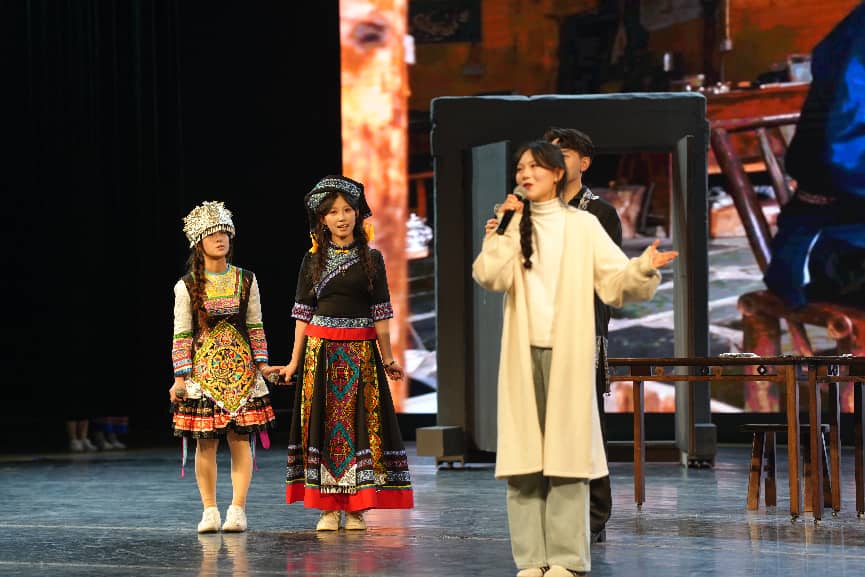 演出中,人工智能技术成为激活传统文化的数字密钥,尽显贵州“四大文化工程”中创新表达的实践成效。学生技术团队运用AI生成侗寨鼓楼、屯堡古戏台、苗族银匠工坊等动态场景,与舞台实景道具相互配合,营造出沉浸式观演体验。演员们以饱满情感演绎各民族人物的坚守与探索,引发观众强烈共鸣,生动践行让传统文化活起来的理念。