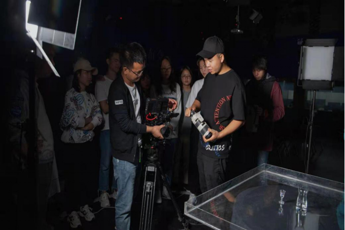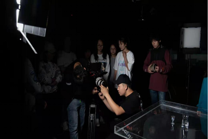 将酒倒入杯中,酒花沿着杯沿向外溢出,透过微观镜头广告画面好像就在眼前,演播厅也似乎变成了广告拍摄现场,“原来广告都是这样拍的”同学们十分兴奋,积极地参与实操。
