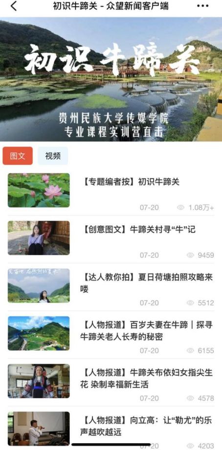据了解,2020级新闻实验班于今年7月前往安顺市牛蹄关村进行新闻采写课程实训营活动,他们以文字、图片、视频等全媒体报道形式讲好“牛蹄关的文化、产业、生态的故事”。不到一周的时间,该班30位学生以小组合作的方式,累计完成了80余条全媒体新闻稿件,人均完成2.6条稿件的内容生产,其中34条稿件还得到了省级主流媒体——多彩贵州网的新闻客户端“众望”,以专题的形式强力推送。