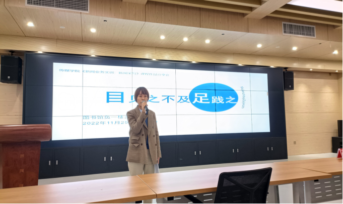 副院长钟华在分享会上讲话,她对2020级新闻实验班的实践活动表示肯定,“2020级新闻实验班的同学用作品践行了今天分享会的主题——‘目见之不及足践之’,他们走到了老百姓当中,真正做到了沉下心去采新闻,走到了与新闻事实、新闻人物最近的地方。”