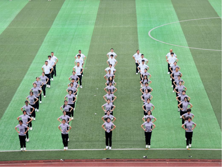 代表方阵伴随着第九套广播体操的节拍,伸手、转体、下蹲、跳跃……动作舒展大方,尽显体操的力量与美感,展现了传媒师生良好的精神面貌与体育精神。