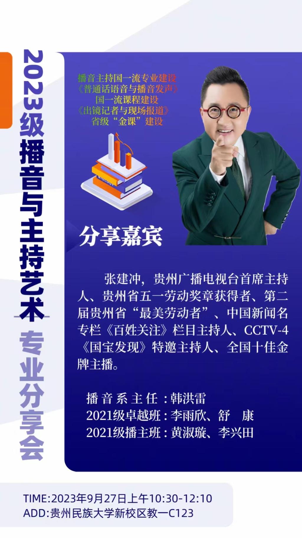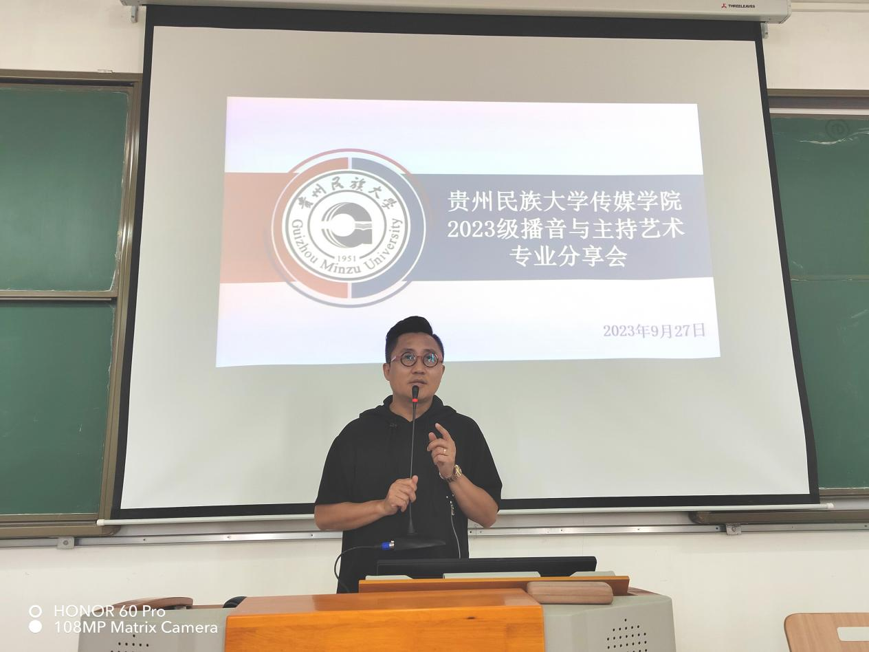 9月27日,贵州广播电视台首席主持人张建冲老师受邀为我院播音与主持艺术系2023级新生开展专业分享会。