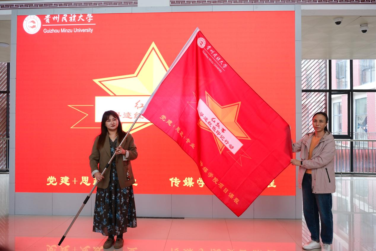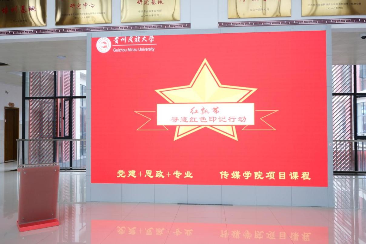 大厅内气氛庄重热烈,“红飘带・寻迹红色印记行动”项目课程出征仪式在此正式举行。校领导、院领导、贵州省党史研究室研究员、贵州卫视记者等嘉宾出席仪式。出征仪式由院长钟华教授主持。