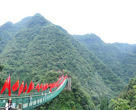 连接小尖山与大尖山的这座桥,叫长空桥。长空桥取名源于毛泽东《忆秦娥•娄山关》词句“长空雁叫霜晨月”。该桥长100米,宽5米,为铁索木板桥。