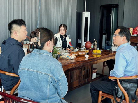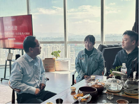 贵阳聚目众一文化传媒有限公司班铭宏总经理对刘祥平教授一行的到来表示热烈欢迎,带领大家参观了直播间、小程序运营等工作区域,对公司的音乐数字传播、小程序“朋友请进”、直播带货三大业务领域进行了介绍。据悉,公司定位于服务青年社群,是贵阳市目前唯一一家运营音乐数字传播的文化传媒有限公司。
